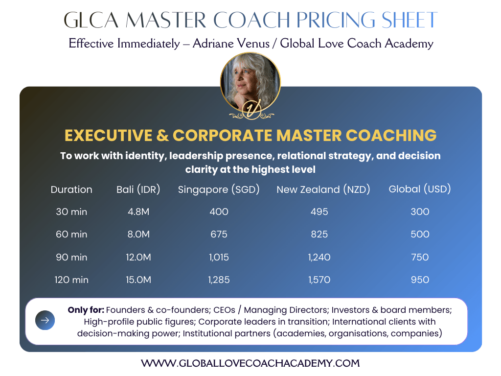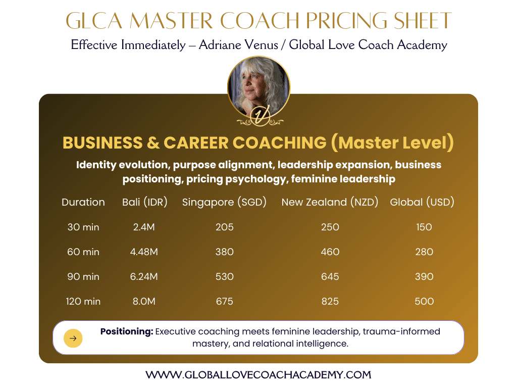 Adriane Venus is a Love Visionary, Mars Venus Coach, and Expert in Quantum Intimacy. With over 30 years of experience, She supports conscious individuals to heal their hearts, ignite self-worth, and embody the Divine Feminine in love, life and legacy. A certified Mars Venus Coach trained by Dr. John Gray, Adriane blends Gender Intelligence, energy healing, emotional alchemy, and intuitive transformation to guide her clients—and her future coaches—into deep love, soul purpose, and aligned relationships worldwide.